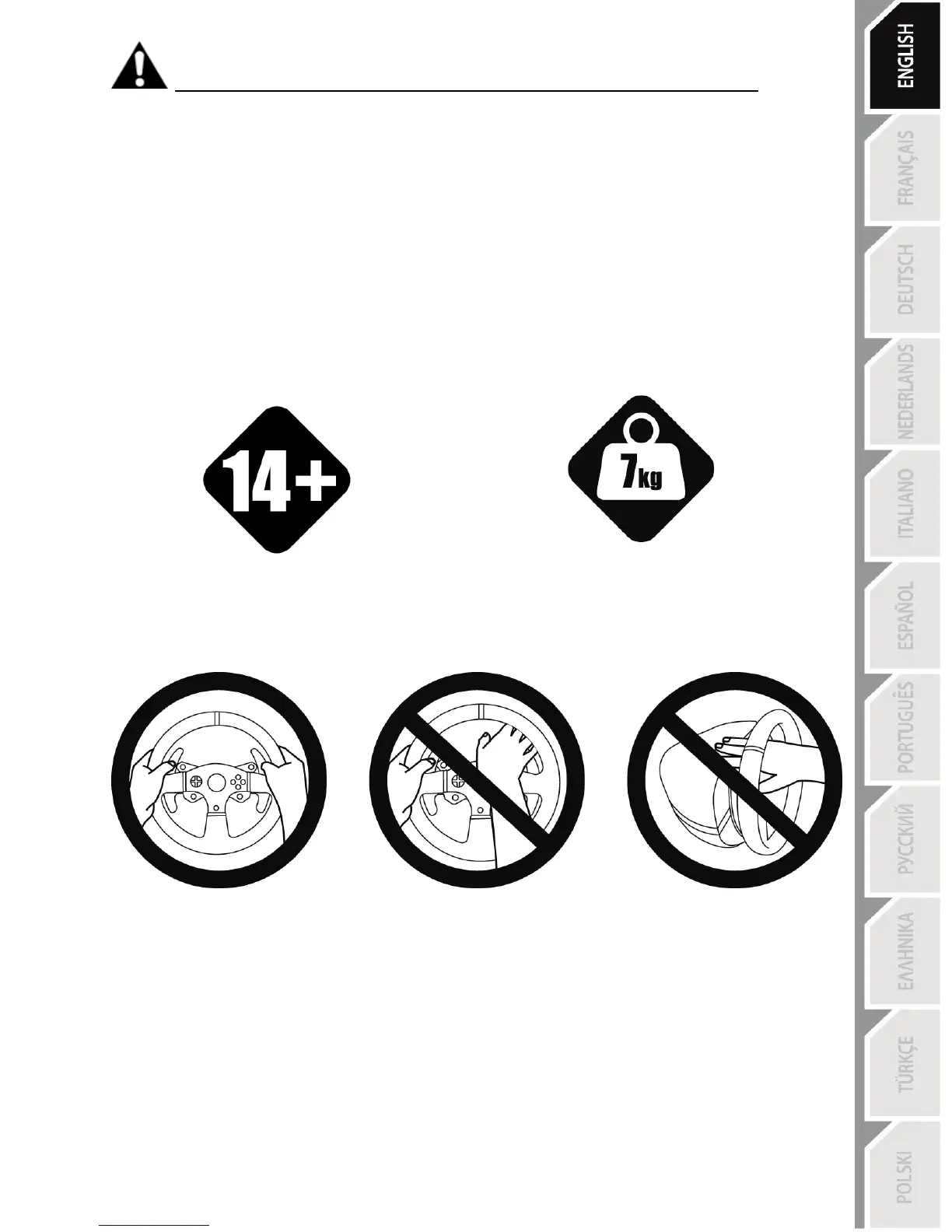 * Make sure that the racing wheel’s base is properly secured, as per this manual’s instructions.