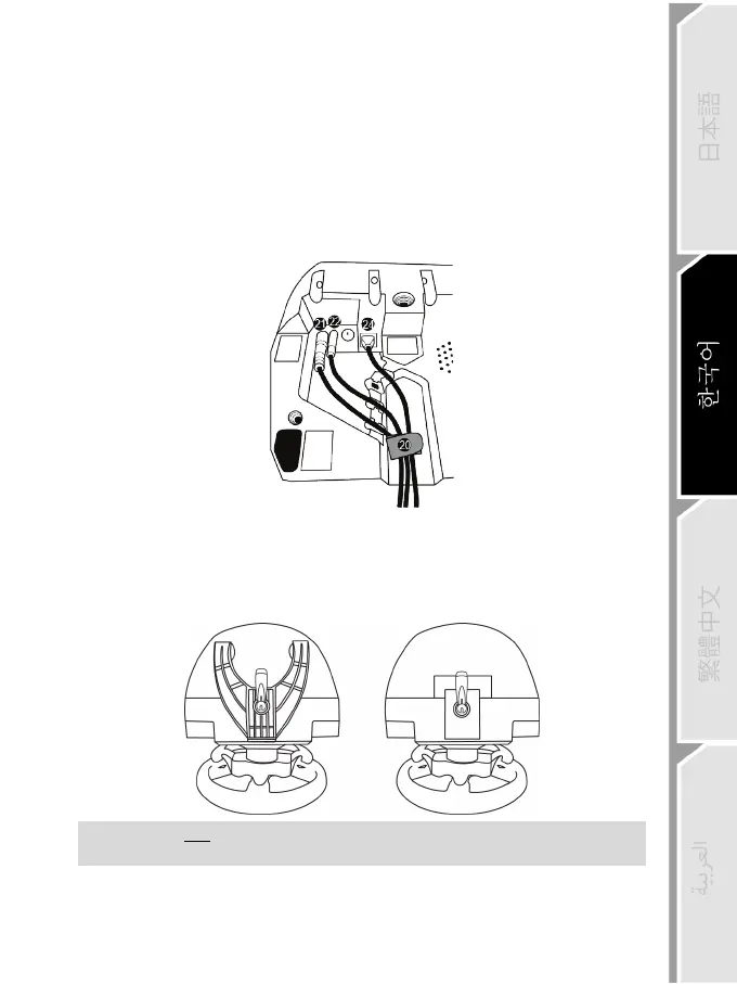 레이싱 핸들 밑에 있는 대형 나사 구멍(18) 에 나사를 끼워서 기기가 완전히 고정될 때까지