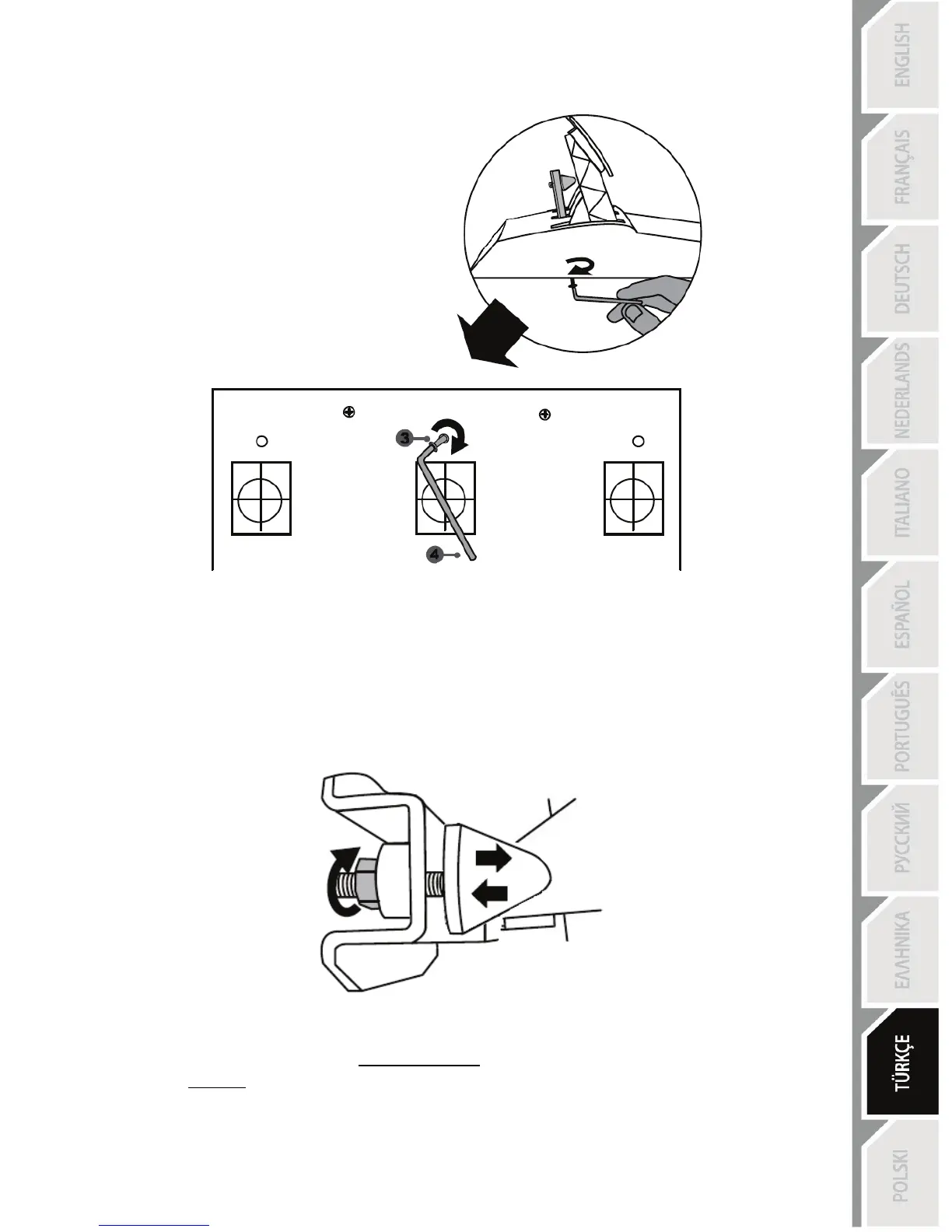 - Ürünle verilen 2,5 mm Allen anahtarını (4) kullanarak üniteyi montaj vidası (3) ve pedal setinin alt