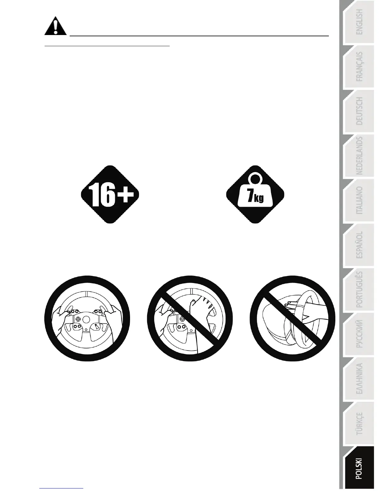 * Podczas kalibracji i gry nigdy nie przekładaj dłoni ani ramion przez otwory w kierownicy.