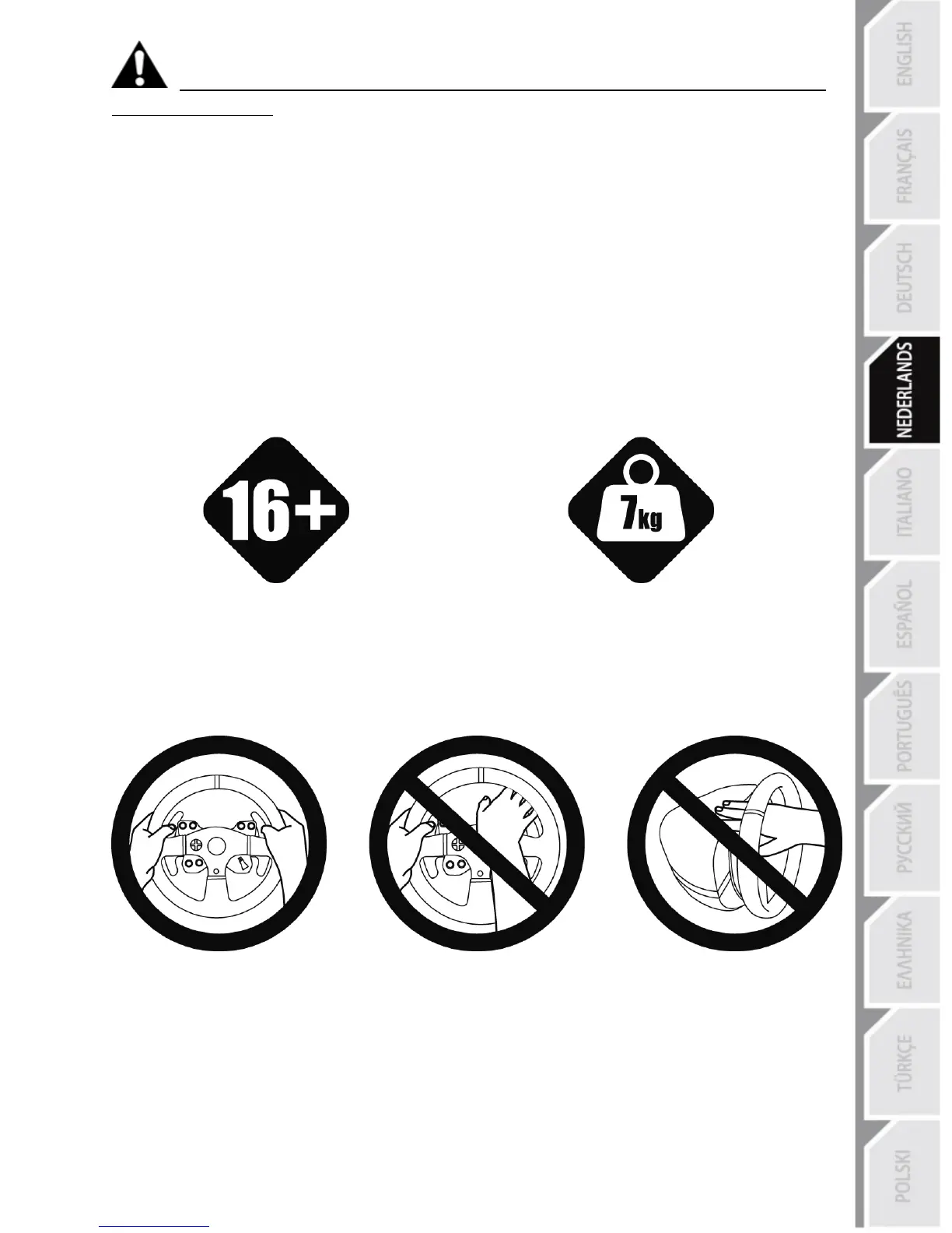 * Houd tijdens het gamen altijd twee handen aan het stuur op de juiste stand en laat het stuur nooit