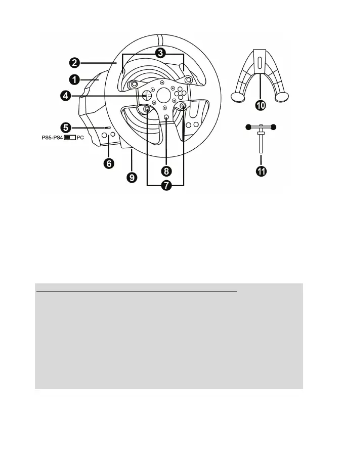 - Para funcionar en PC, el interruptor deslizante de USB (5) de la base del volante de carreras