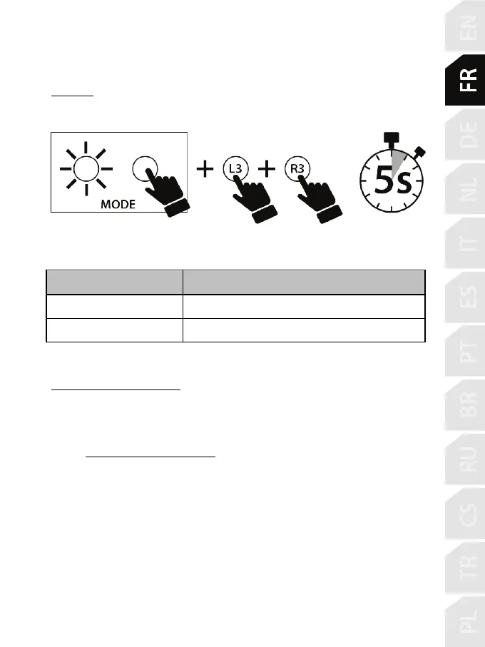 Appuyez simultanément sur les boutons MODE + L3 + R3 (situés sur la base du T300) pendant cinq