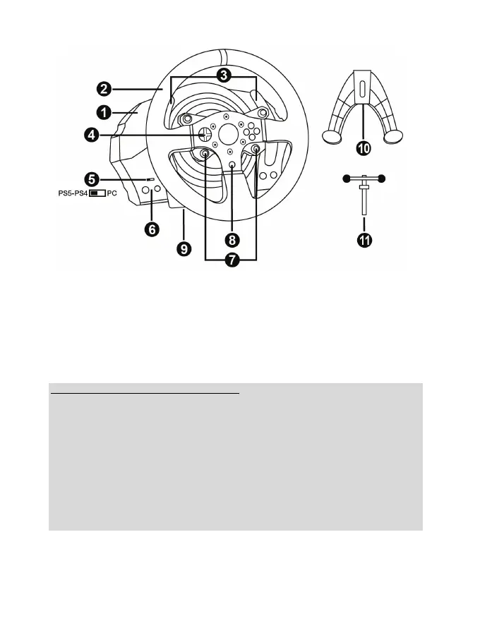 - Um am PC zu funktionieren, muss der USB-Schiebeschalter (5) an der Basis des Rennlenkrads