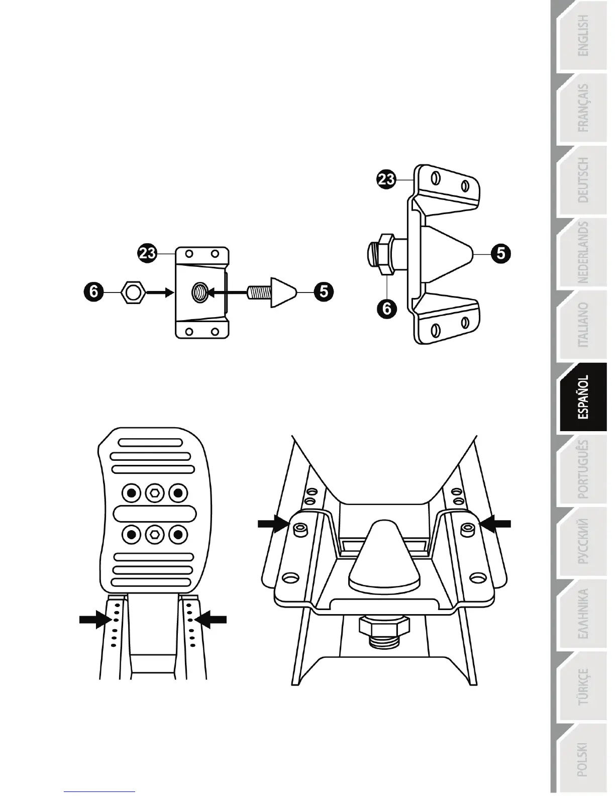 - A continuación, sujeta el tope metálico (23) detrás del brazo del pedal usando sólo 2 tornillos