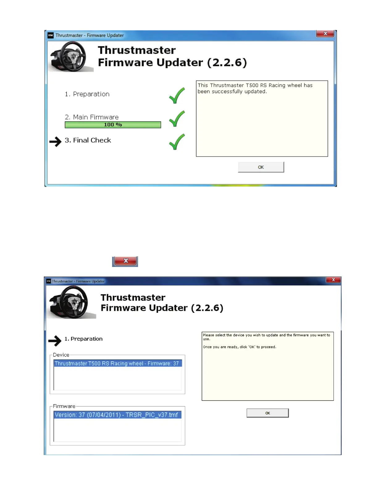 7) Auf OK klicken, um zum Hauptfenster des Firmware-Updaters zurück zu kehren,