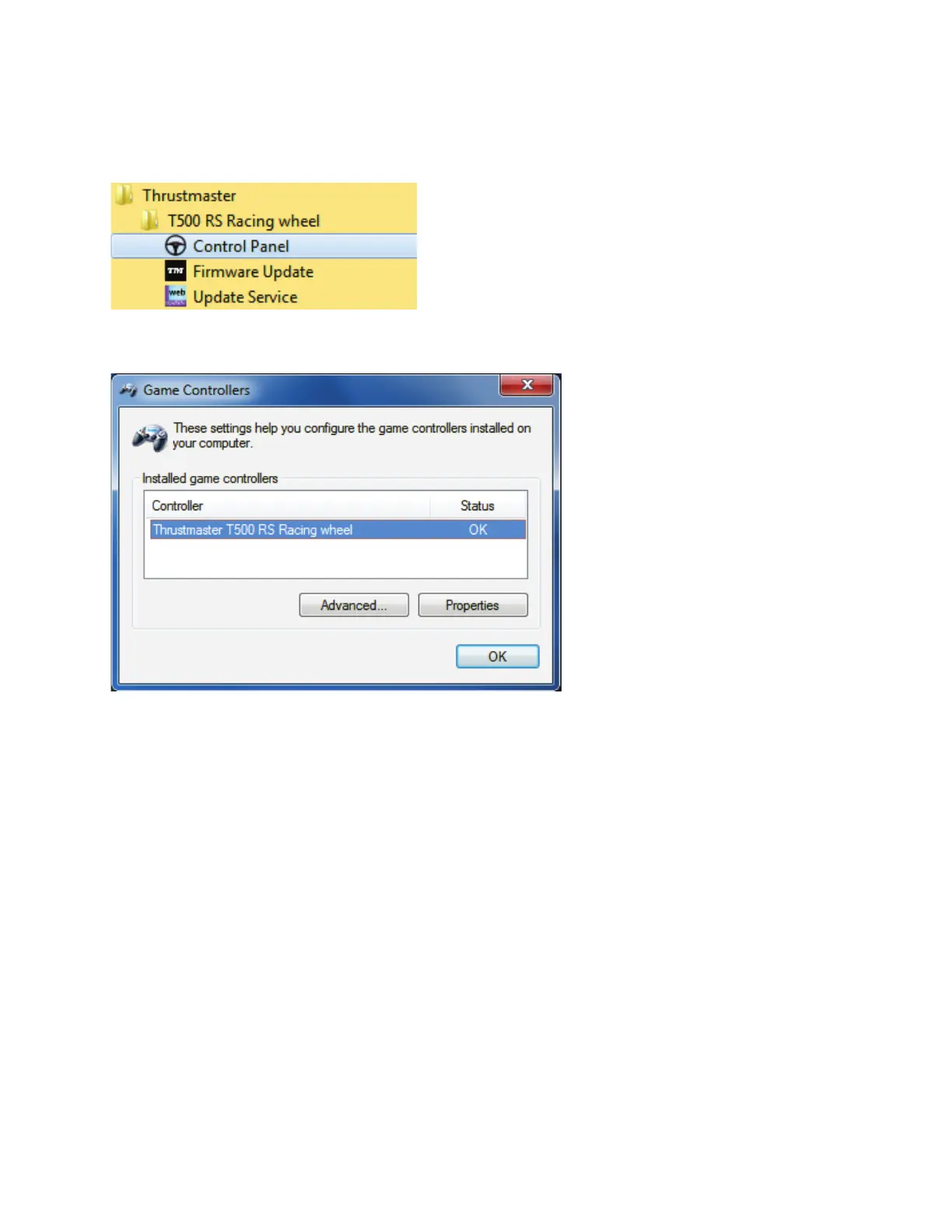 korrekt aufgeführt wird (Start > Alle Programme > Thrustmaster > T500 RS Racing
