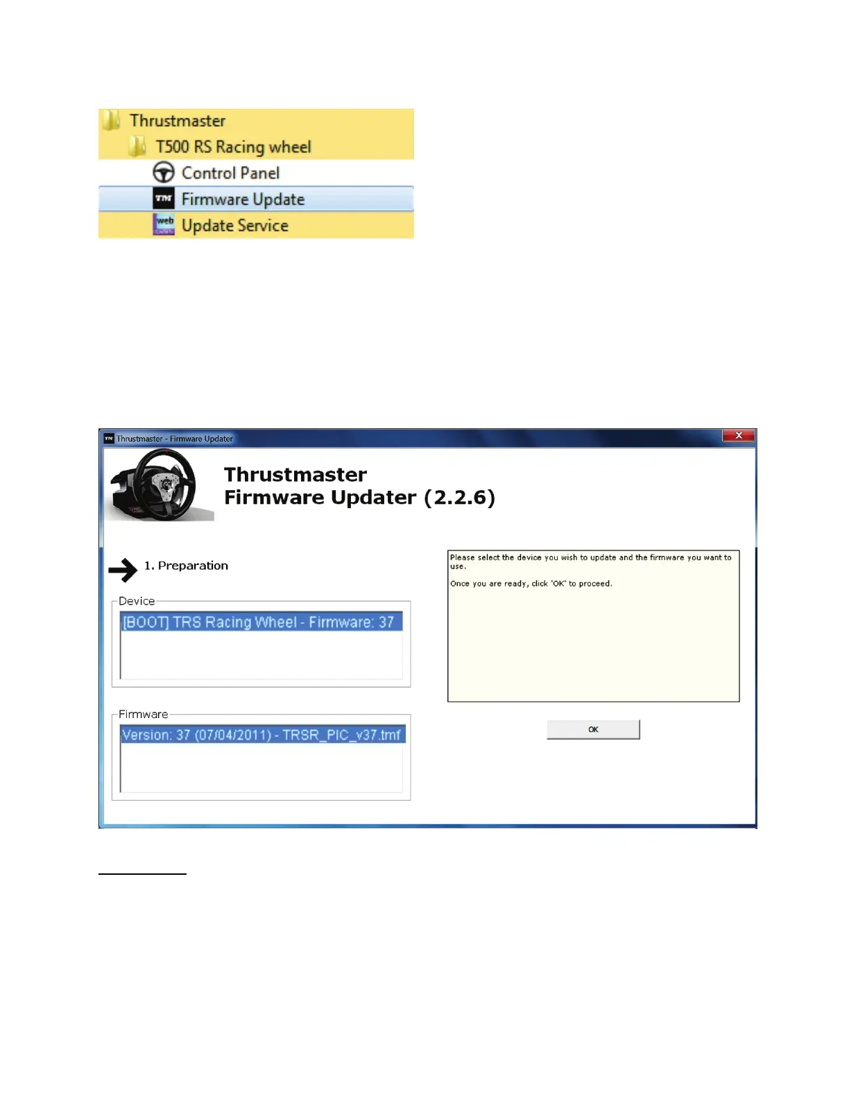 Het venster van de Thrustmaster – Firmware Updater wordt weergegeven.