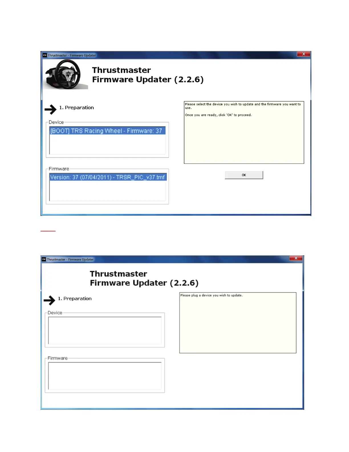 5) Surge no ecrã a janela Thrustmaster – Firmware Updater.