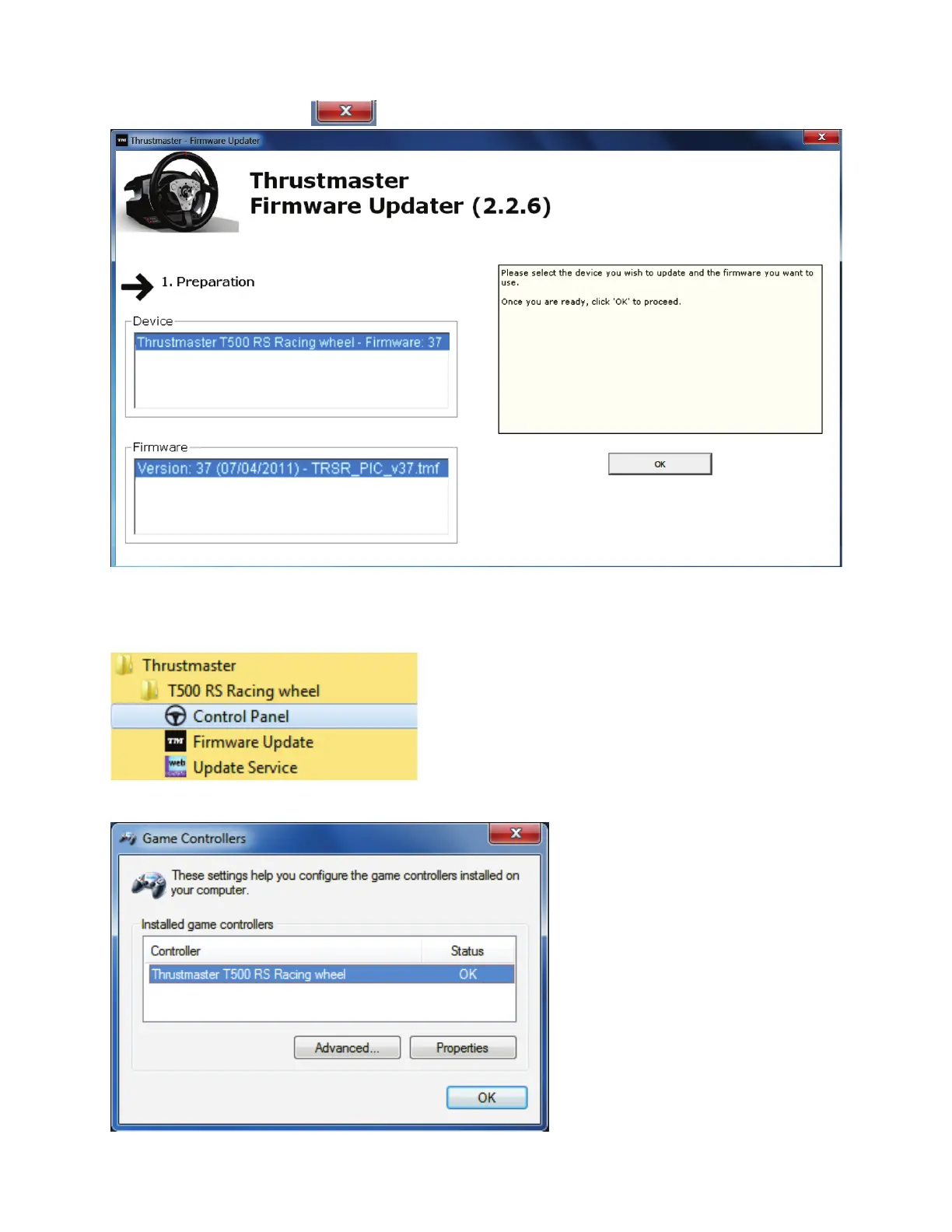 нормально в панели управления (Пуск > Все программы > Thrustmaster > T500