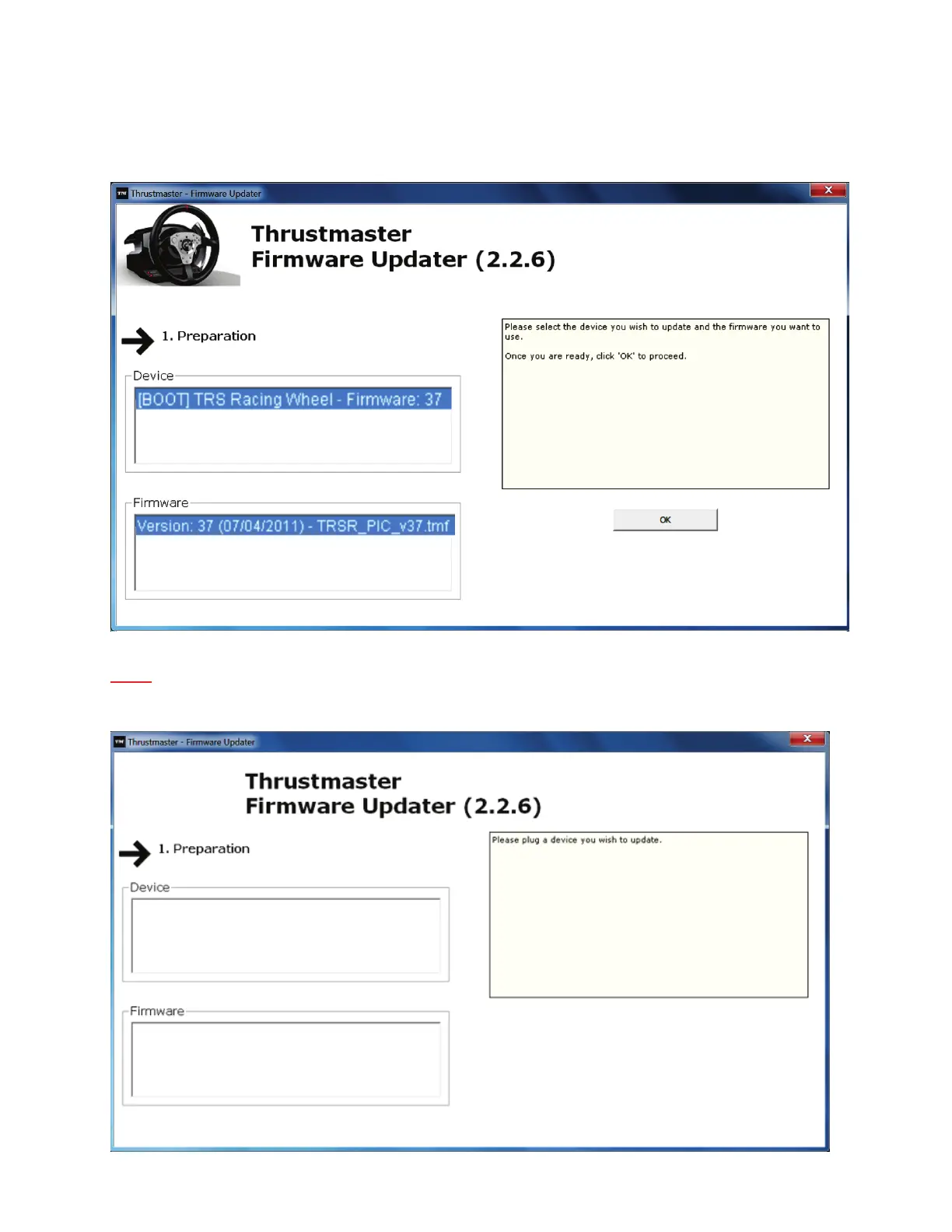 The Thrustmaster – Firmware Updater window appears onscreen.