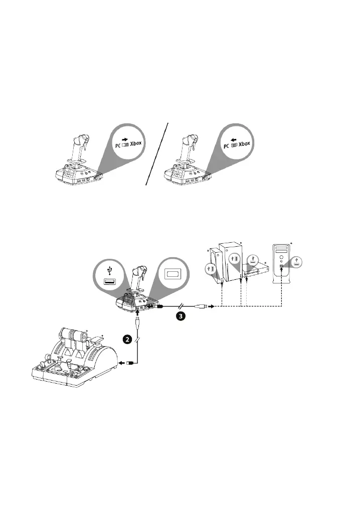 1. 將位於搖桿背部的選取器開關 (14) 置於 Xbox 或 PC 位置。
