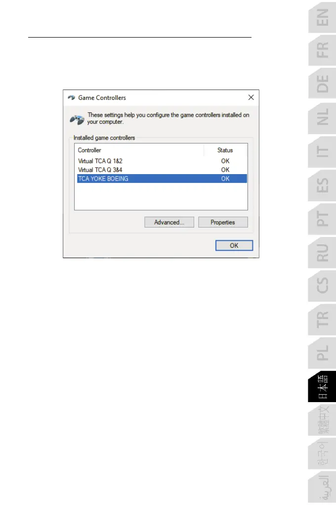 は、TCA Quadrant Boeing Edition のゲーム コントローラーダイアログボックス