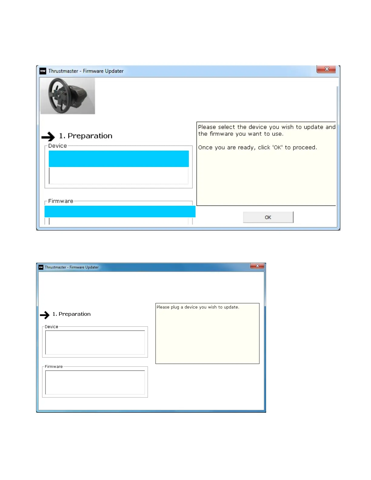 5) 画面に、[Thrustmaster – Firmware Updater] ウィンドウが表示されます。