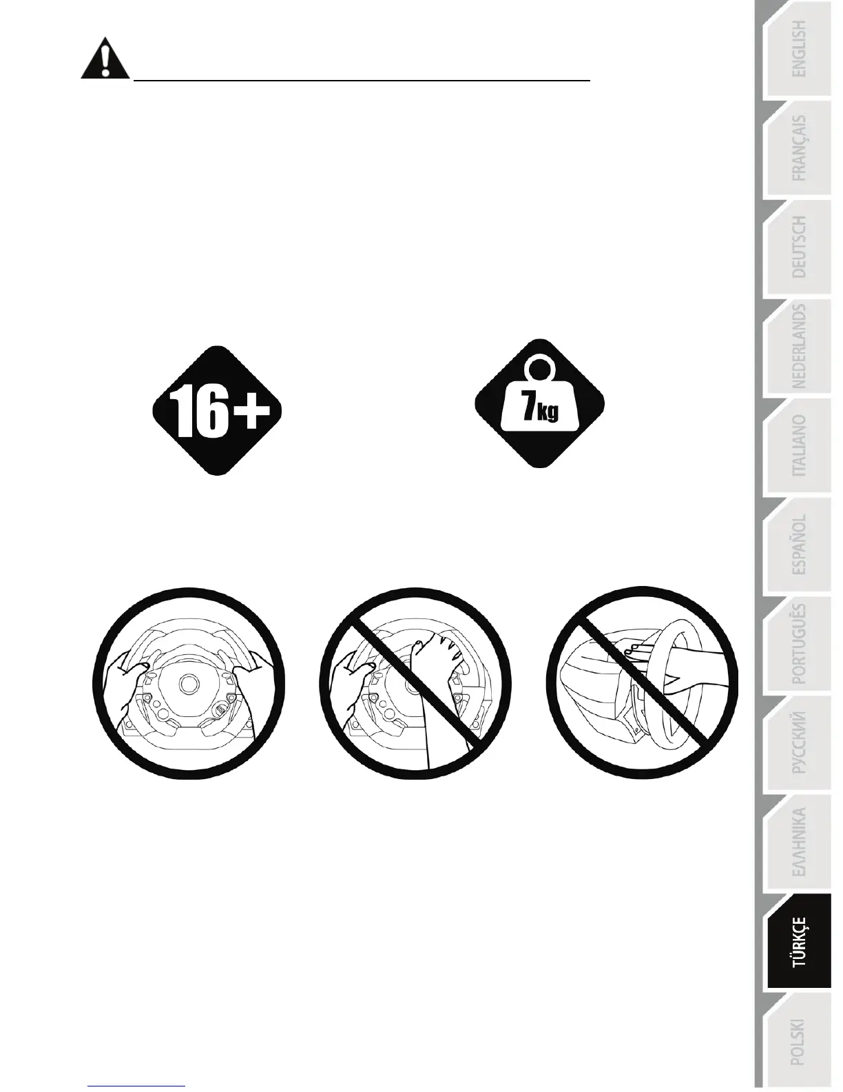 * Kalibrasyon ve oyun sırasında asla elinizi veya kolunuzu yarış direksiyonundaki deliklere sokmayın.