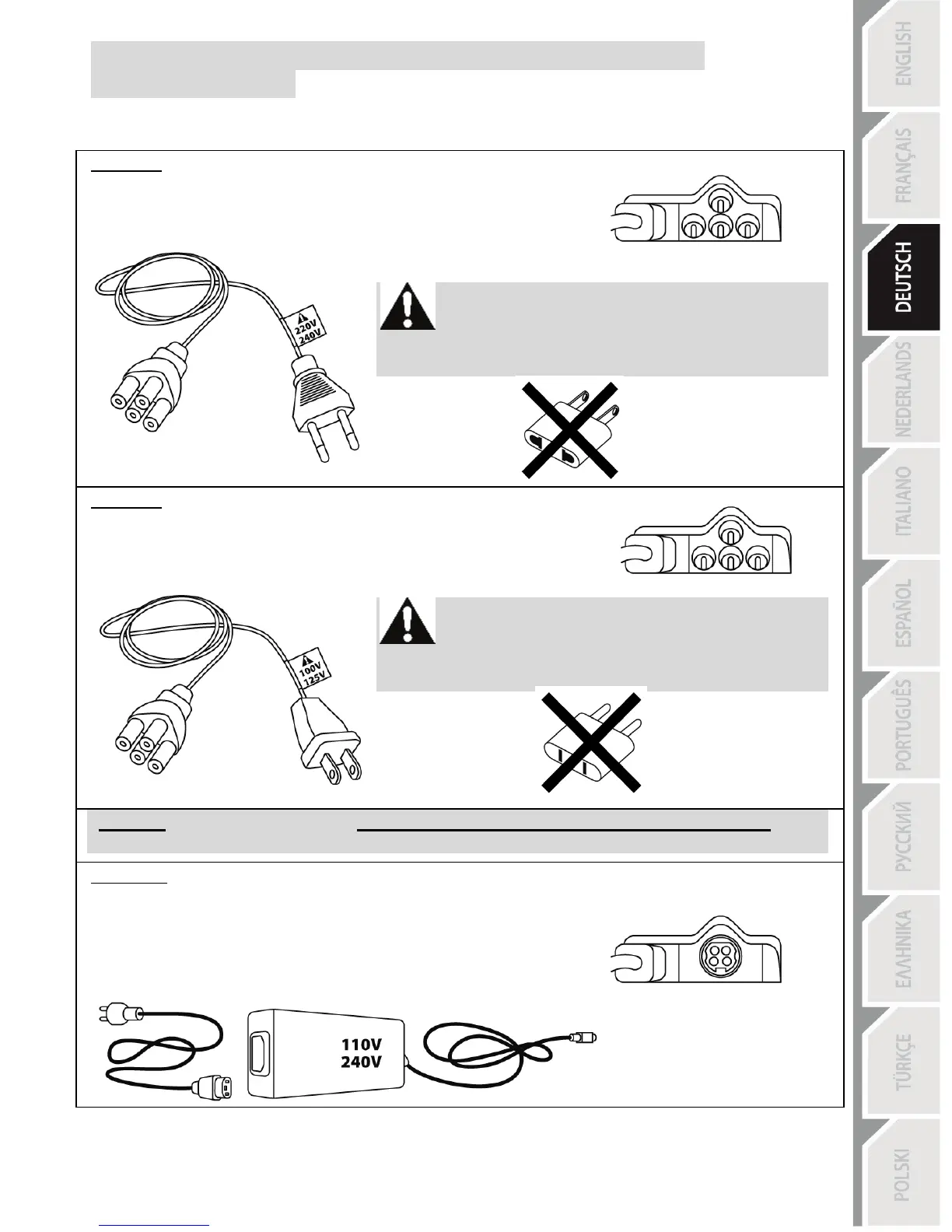 Das 100-125V Kabel niemals an eine 220-240V
