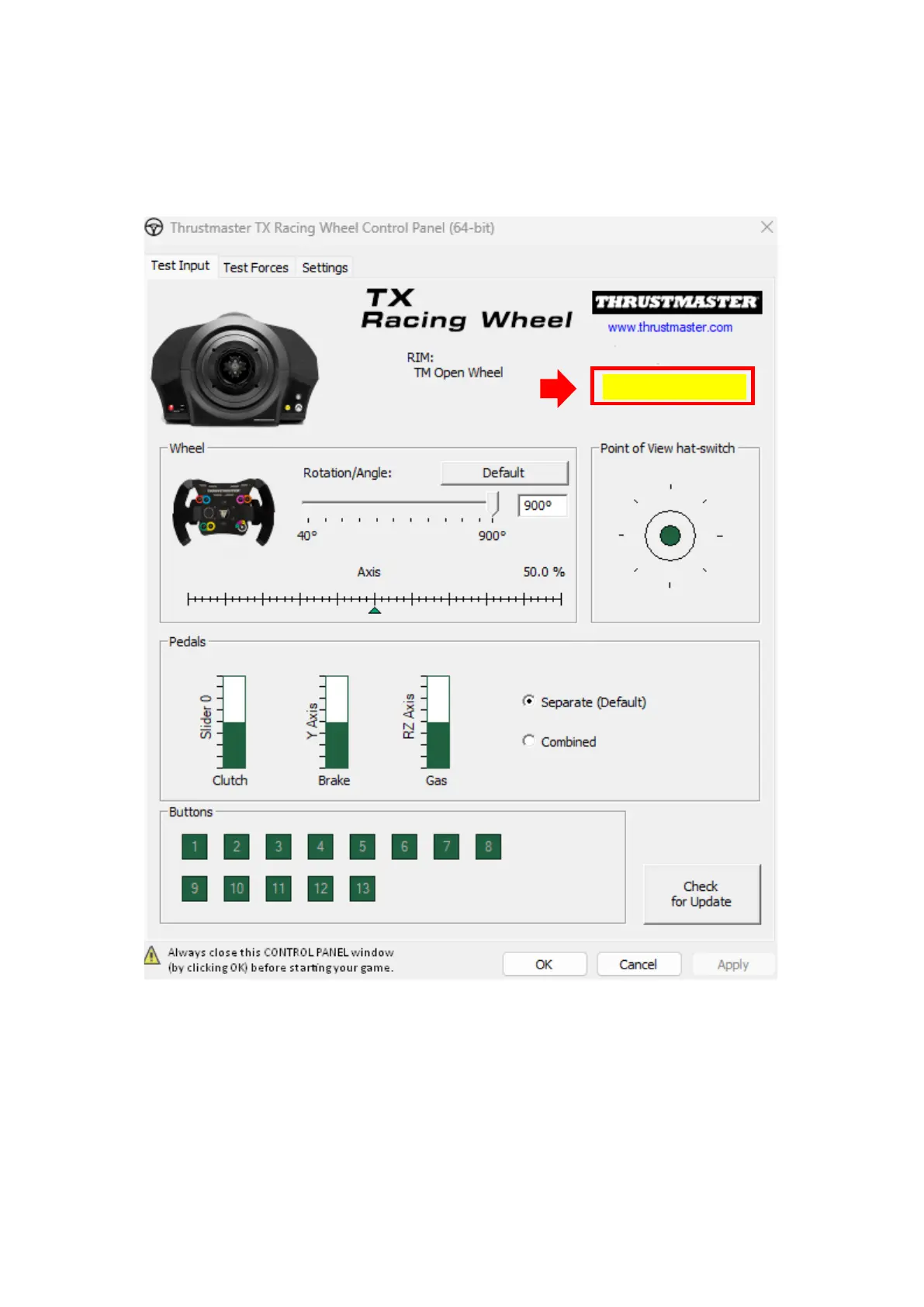 La version actuelle du Firmware de votre volant apparait en haut à droite de la