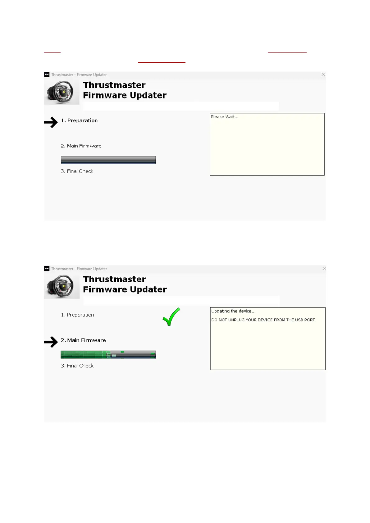 重要: 指示がない場合は、ステアリングコントローラーを USB ポートから取り外したりファ