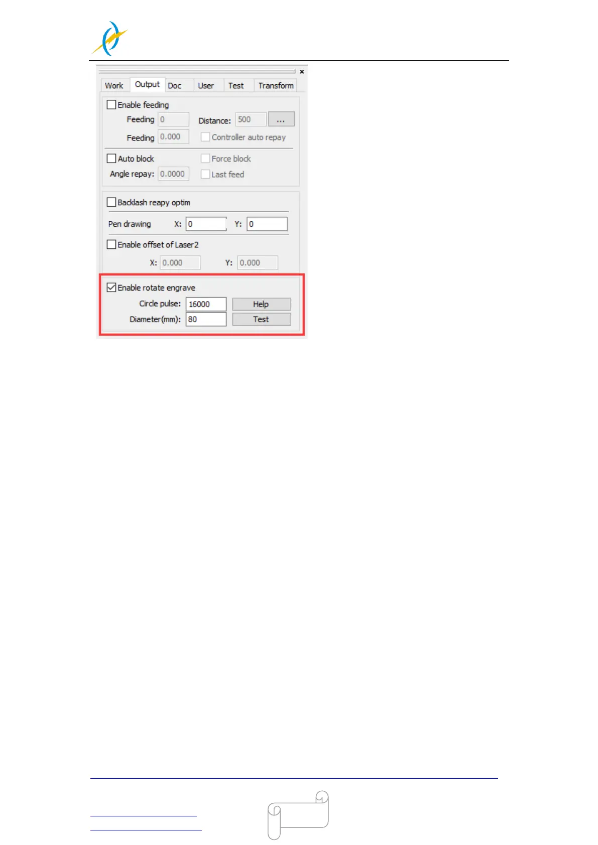 Select “Output”, and then tick“Enable rotate engrave”
