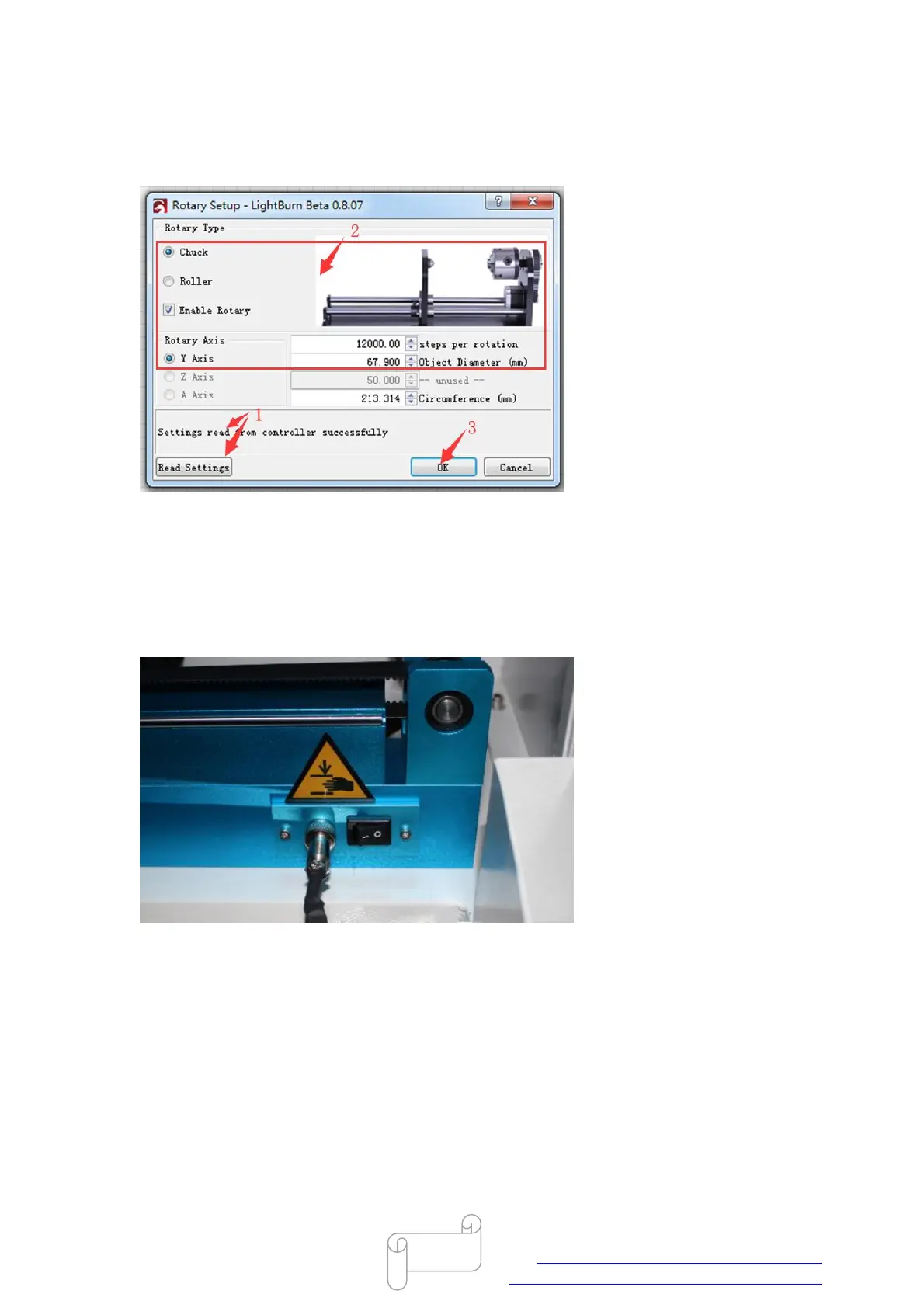 In Lightburn, Read settings(successfully)>>tick “Chunk”,”Enable Rotary” and “Y Axis”>>set “steps