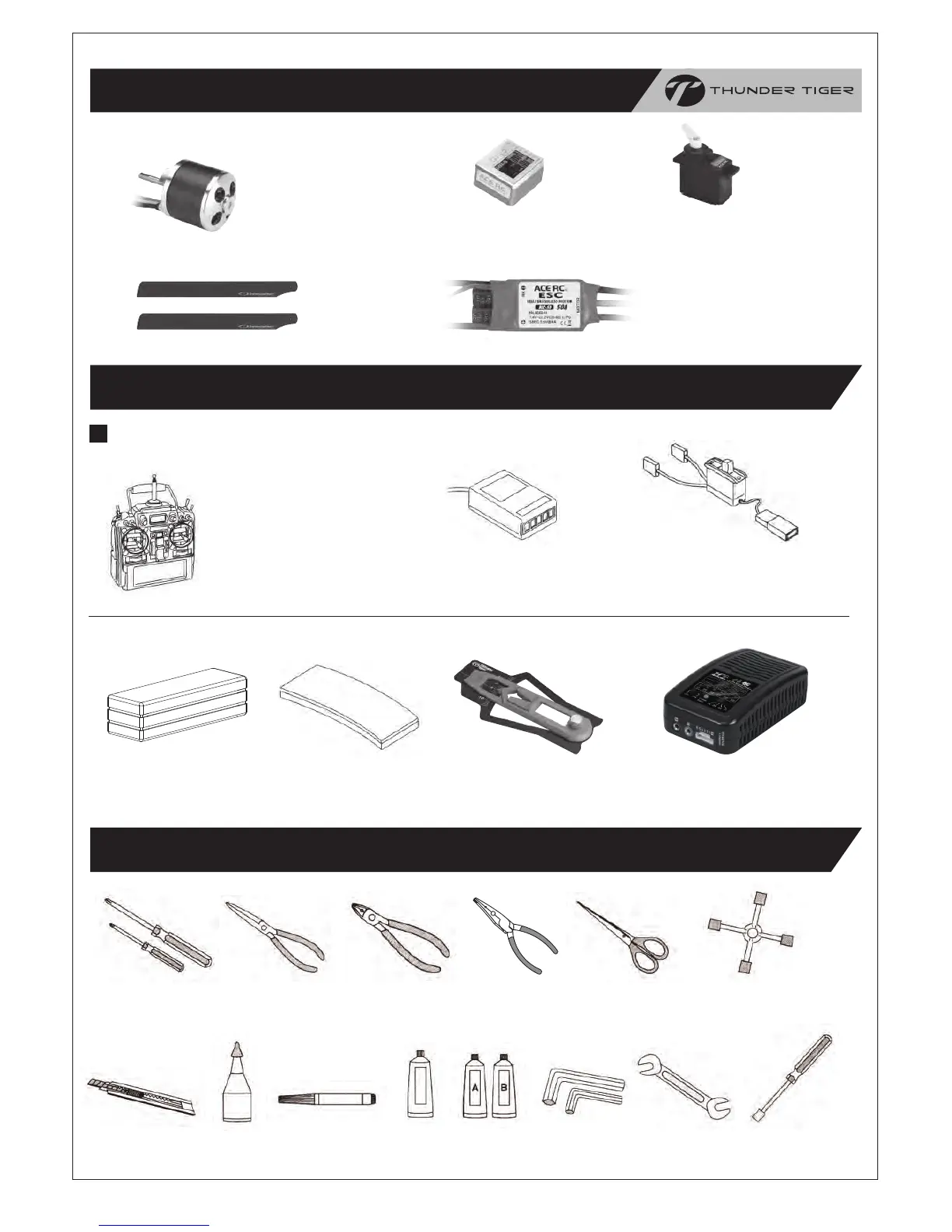 THUNDER TIGER Raptor E300 md - Contents Included 內容物說明; Additional Items Required 另購配件; Tools May Require for Maintenance 維修工具