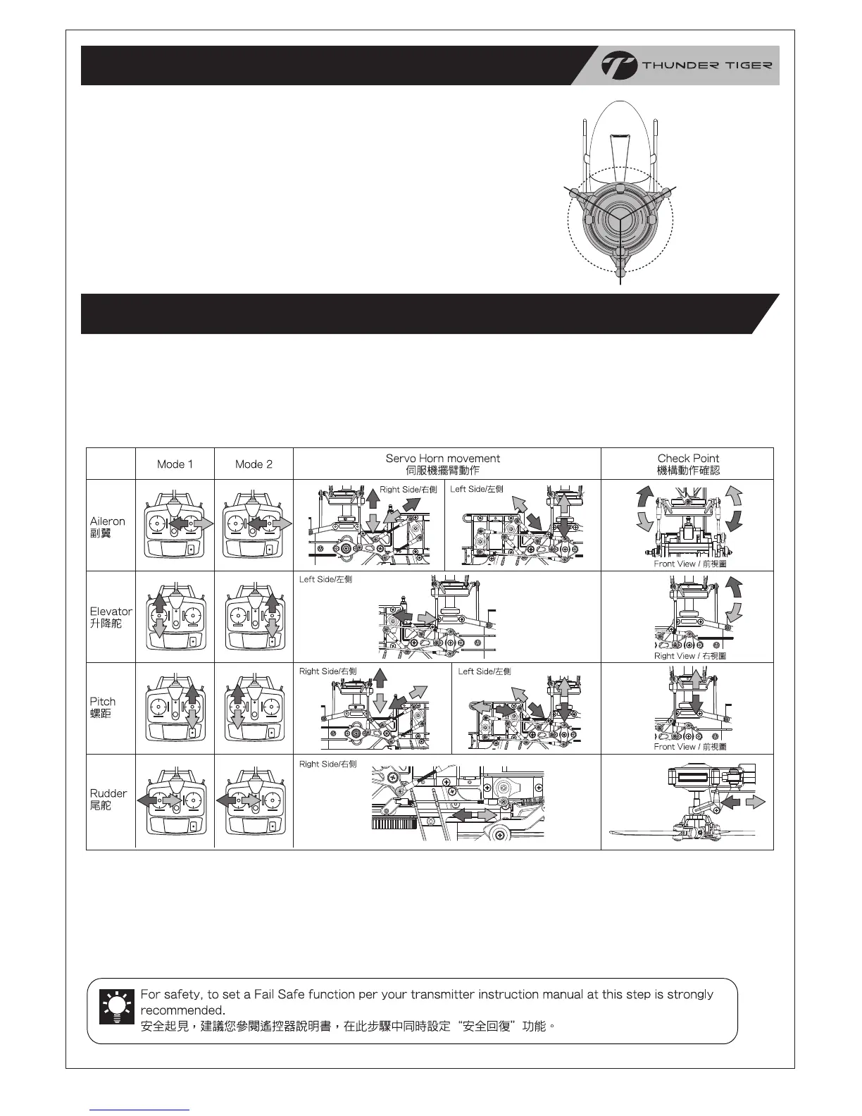 各品牌遙控系統伺服機方向訊號或有不同,請依序開啟發射機及接收機,參閱以下圖示確認十字盤及伺服機作動方向正確,同時觀