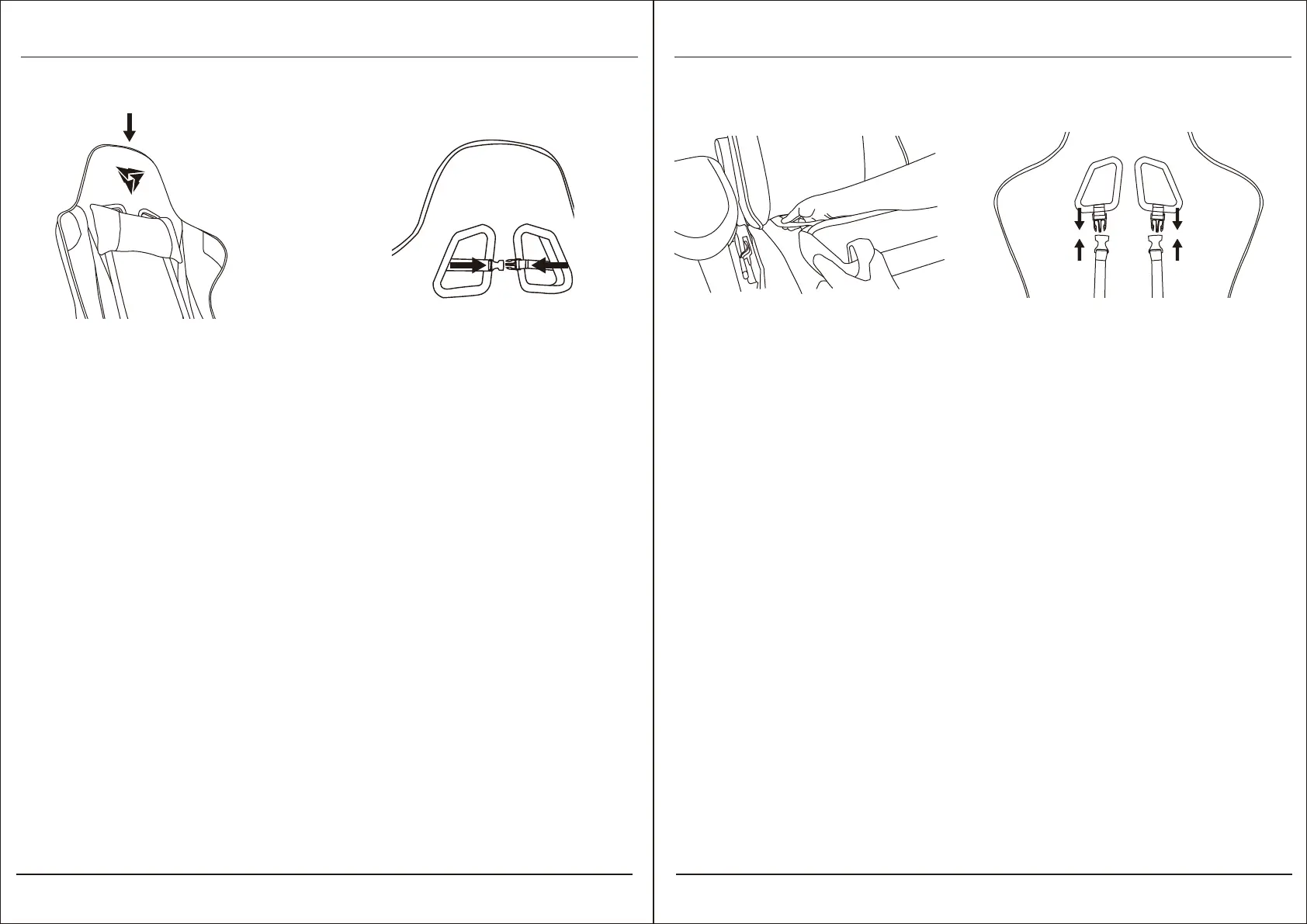 1. 将头枕放在靠背上。 2. 将松紧带拉到椅背后,并将它们一起扣上。