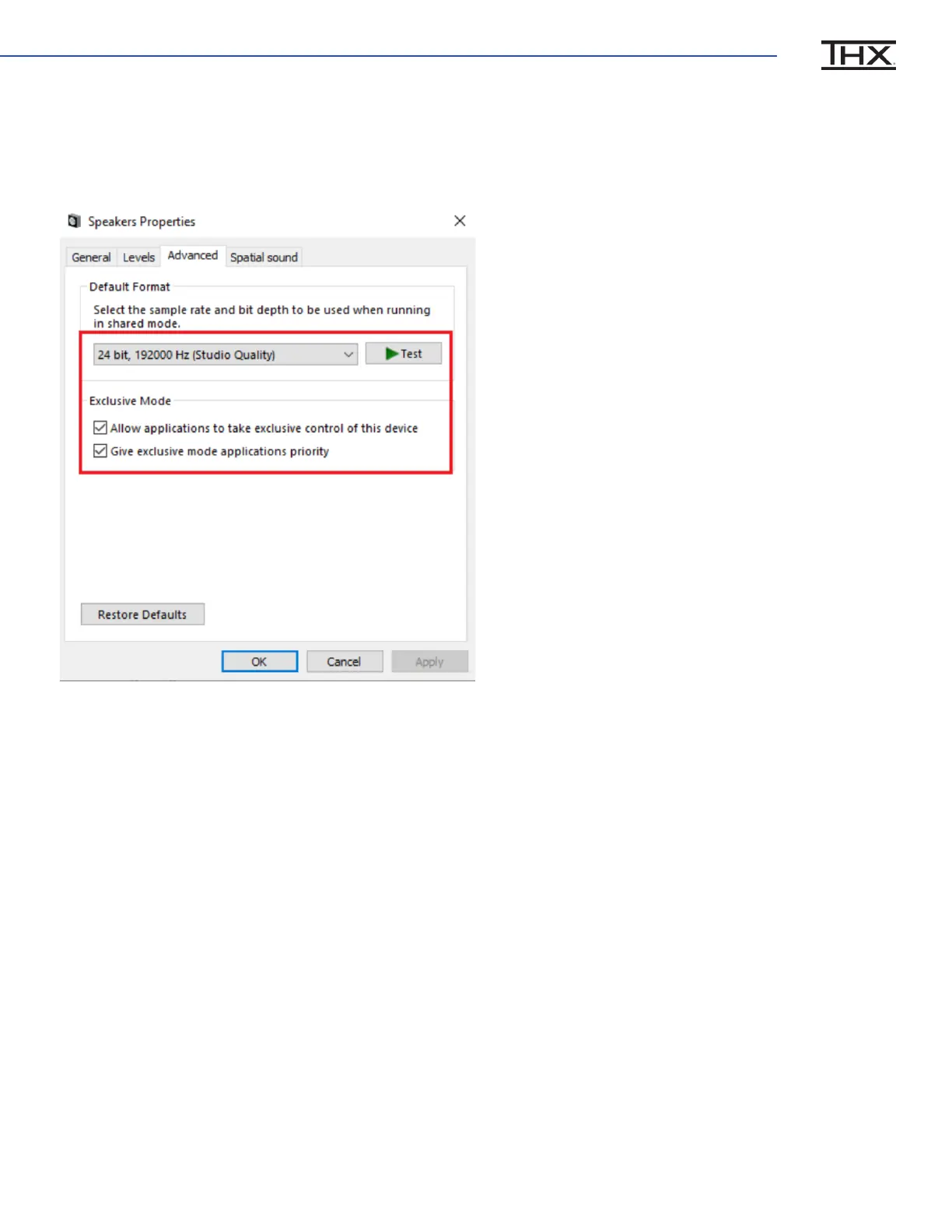 In the advanced Tab, set the Default Format to 24 bit, 192000 Hz, and check the two boxes