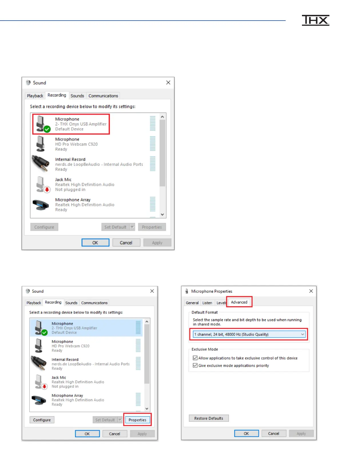 the Recording tab. Set THX Onyx as the Default Device. Verify you see the green check mark