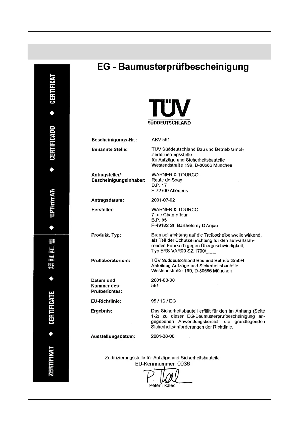 ThyssenKrupp Mini gearless DAF270 - Type Test Examination Certificate for Brake