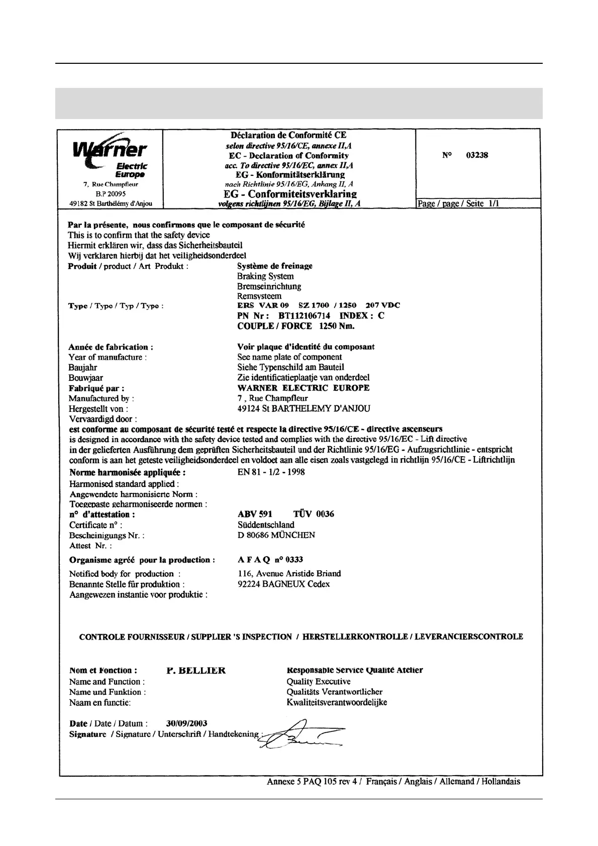 ThyssenKrupp Mini gearless DAF270 - Declaration of Conformity for Brake