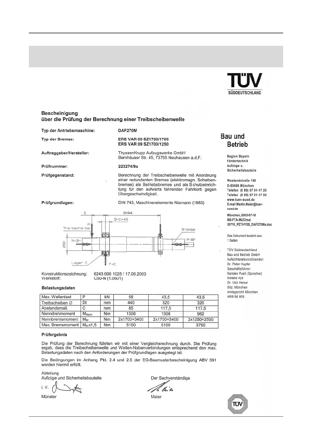 ThyssenKrupp Mini gearless DAF270 - Type Examination Certificate for Calculation of Traction Sheave Shaft