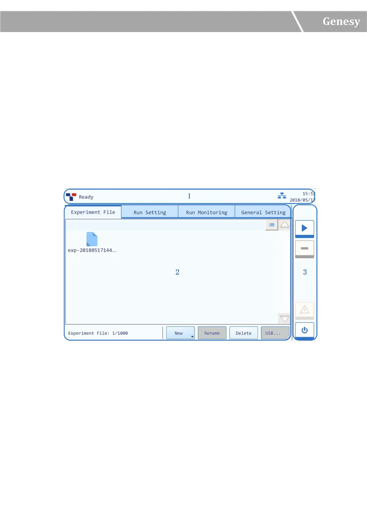 1. Status Bar: display the system status, current file name, instrument status and system time.