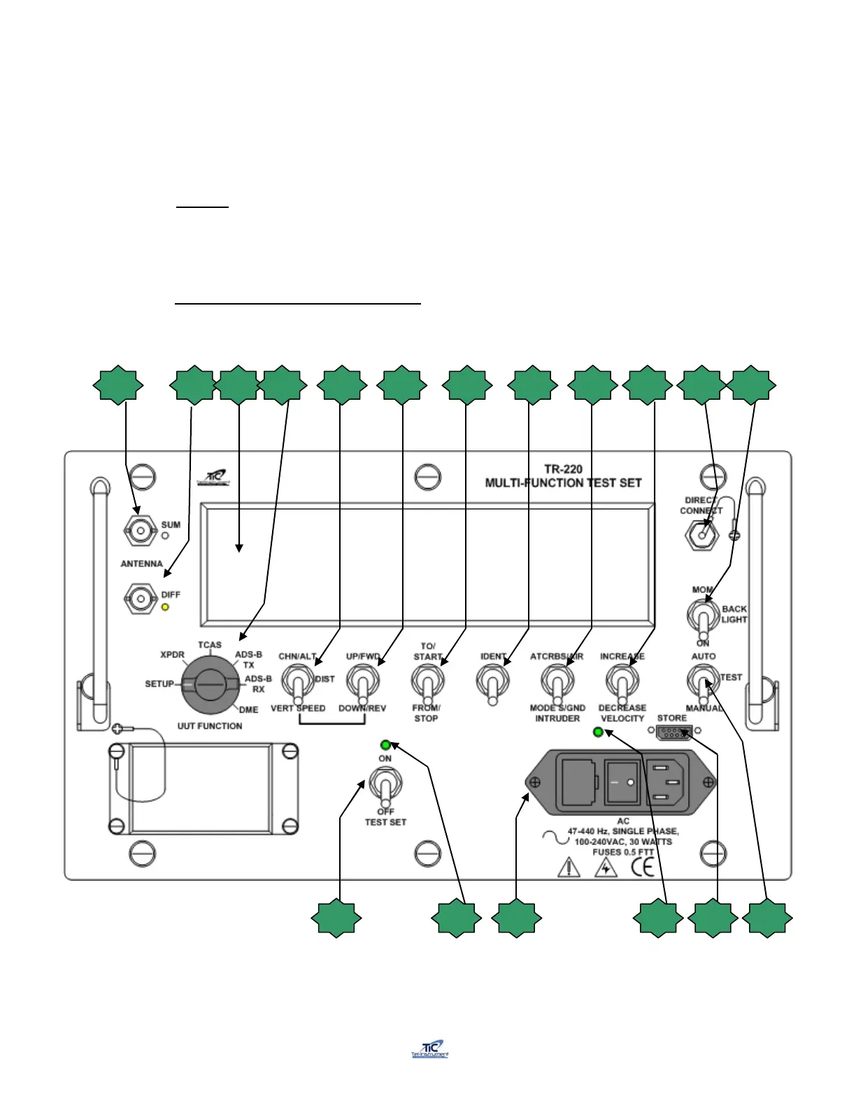 controls, indicators, and connectors are located on the front panel of the Test Set.