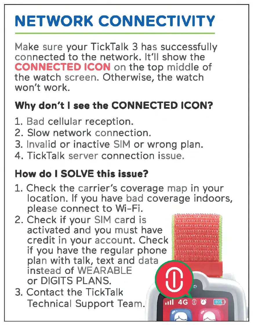 TickTalk TICK TALK 3 - Network Connectivity; Connected Icon and Troubleshooting