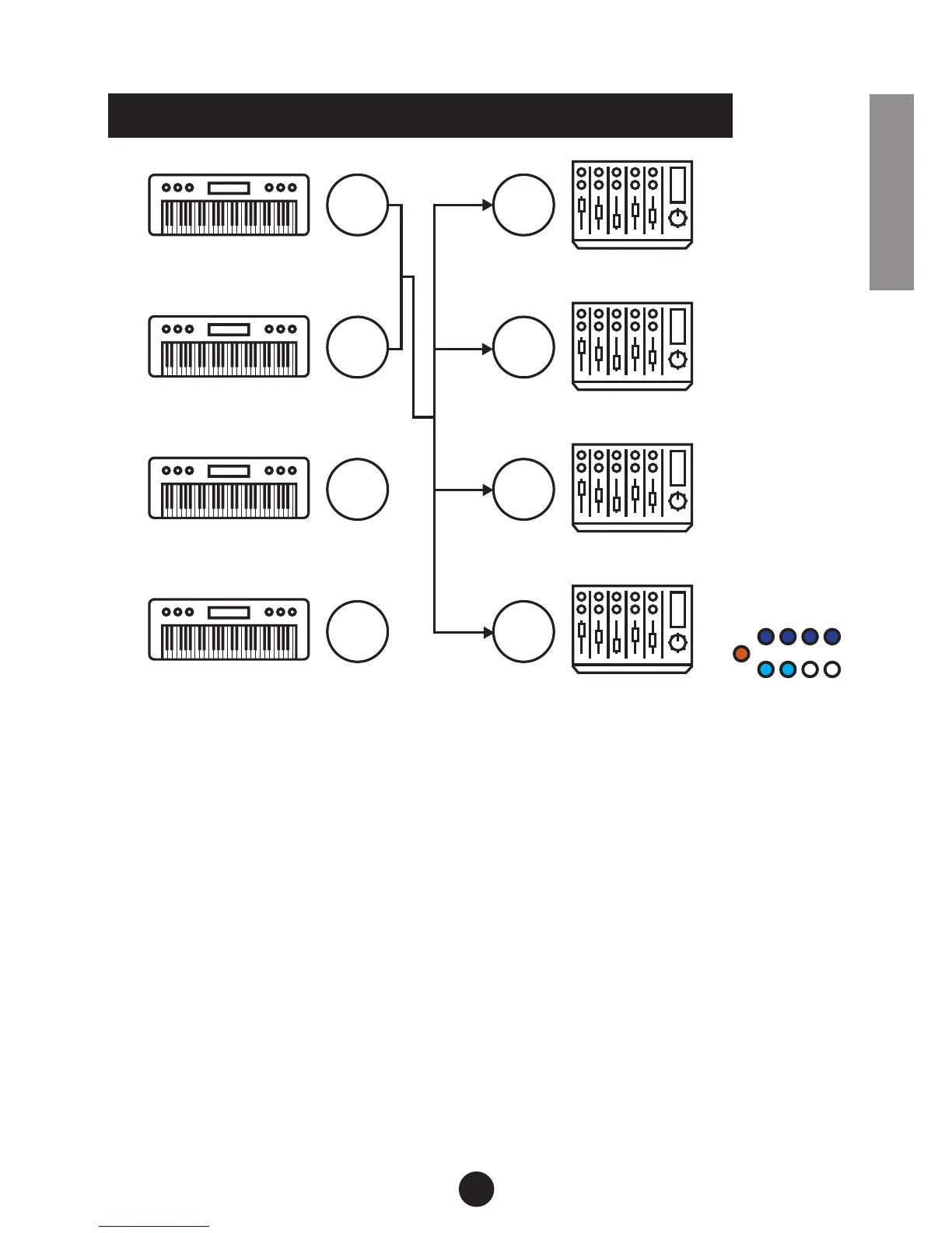 zusammengemischt werden und stehen allen vier Ausgängen zur Verfügung.