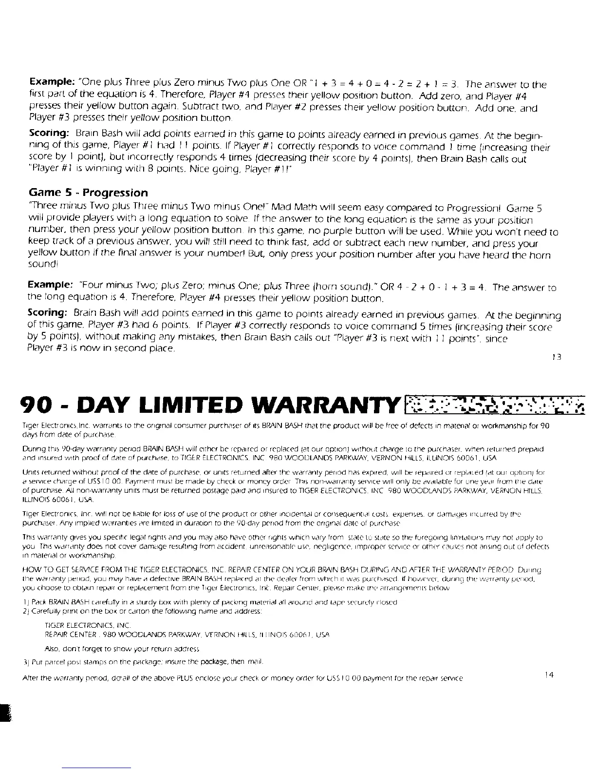 Tiger Electronics 92-002 - Game 5: Progression; Long Equation Matching; Product Warranty Information; 90-Day Limited Warranty Details