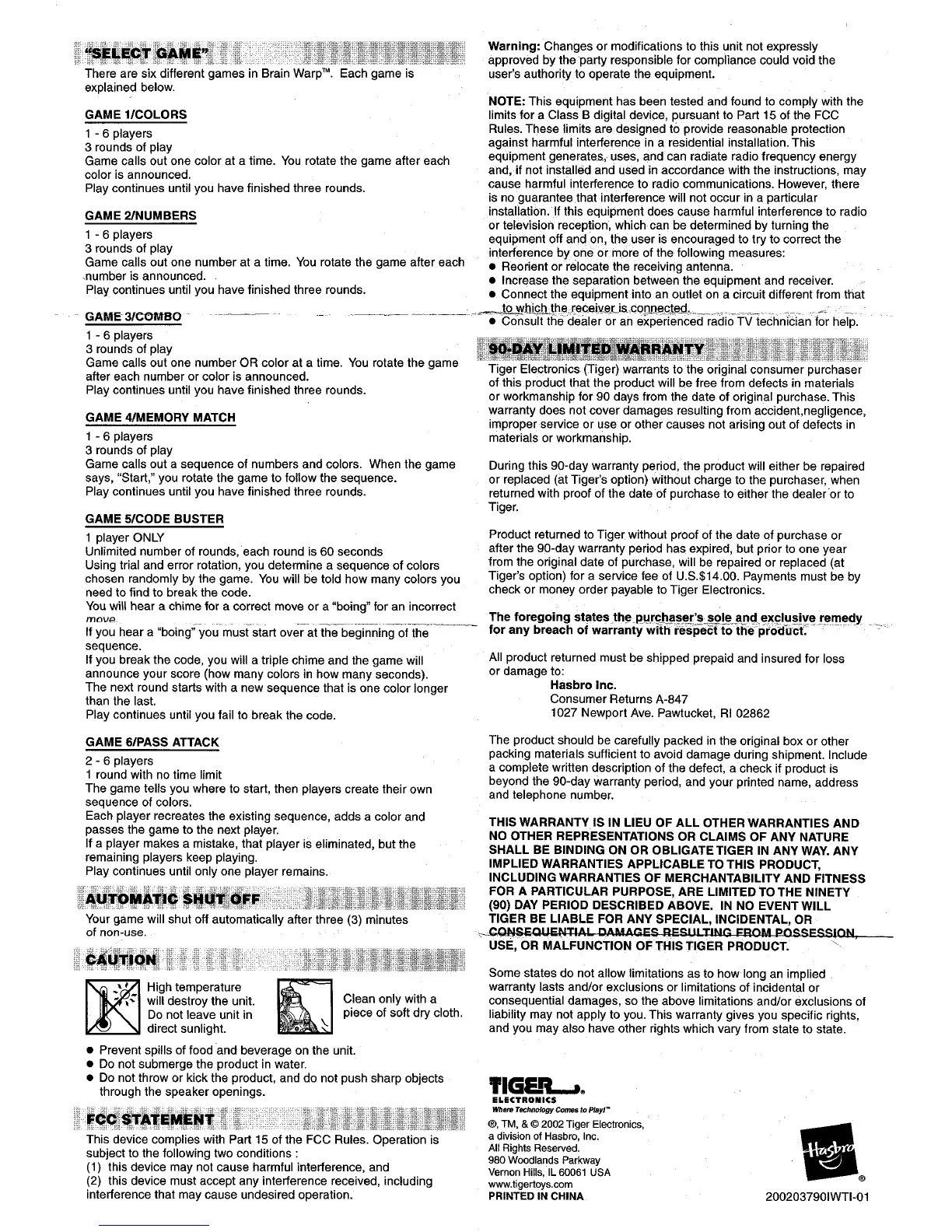 Tiger Electronics Brain Warp - Game Selection; Game 1: Colors; Game 2: Numbers; Game 3: Combo