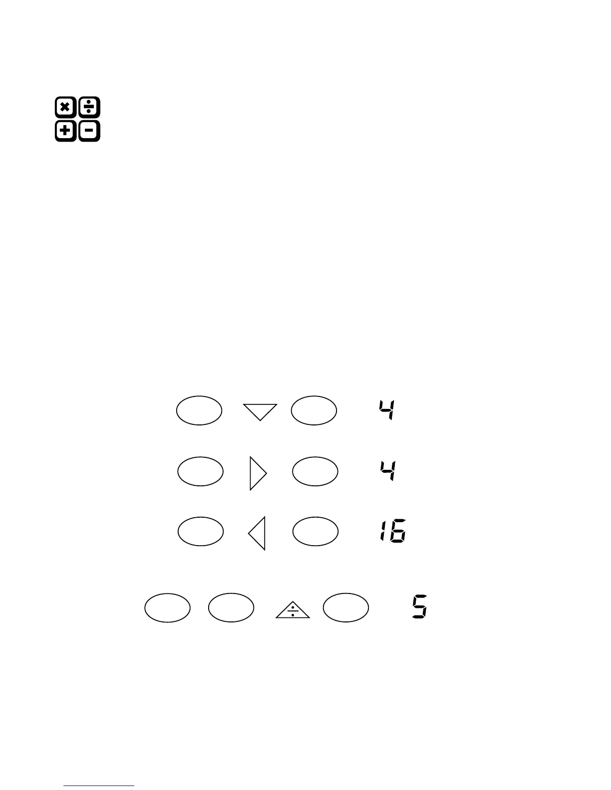 Multiplication: Press 4, press x (times), press 4, press =. The product is 16.