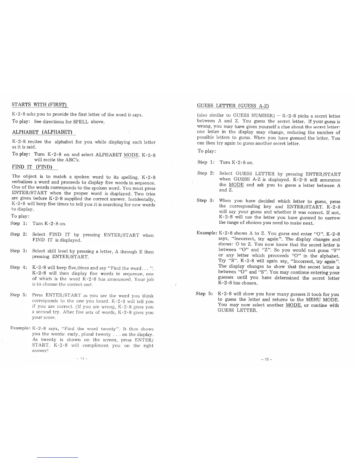 Tiger Electronics K28 Talking Learning Computer 7-230 - Specific Game Modes: Alphabet and Guessing; Alphabet and Word Finding Games; Guessing and Identification Games