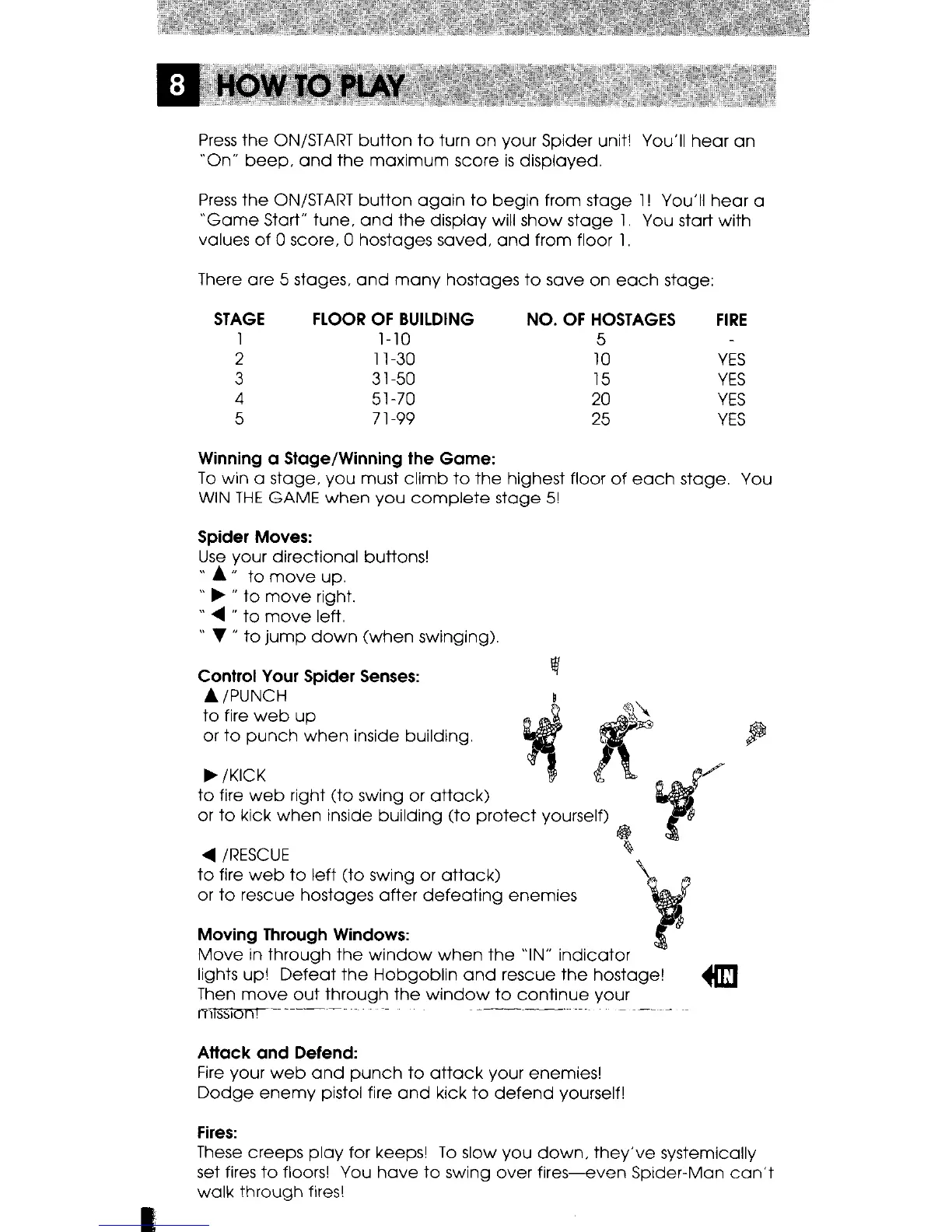 Tiger Electronics Marvel Spider-Man 7-853 - How to Play; Spider Moves; Control Your Spider Senses; Moving Through Windows