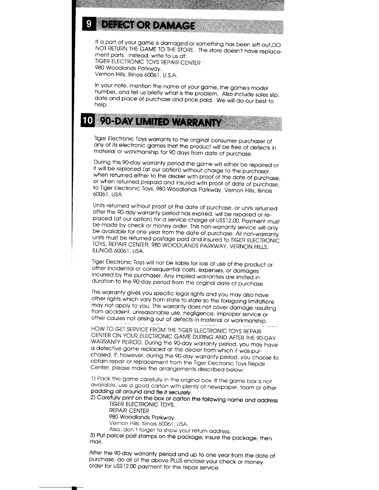 Tiger Electronics Marvel Spider-Man 7-853 - Defect or Damage; 90-Day Limited Warranty; How to Get Service
