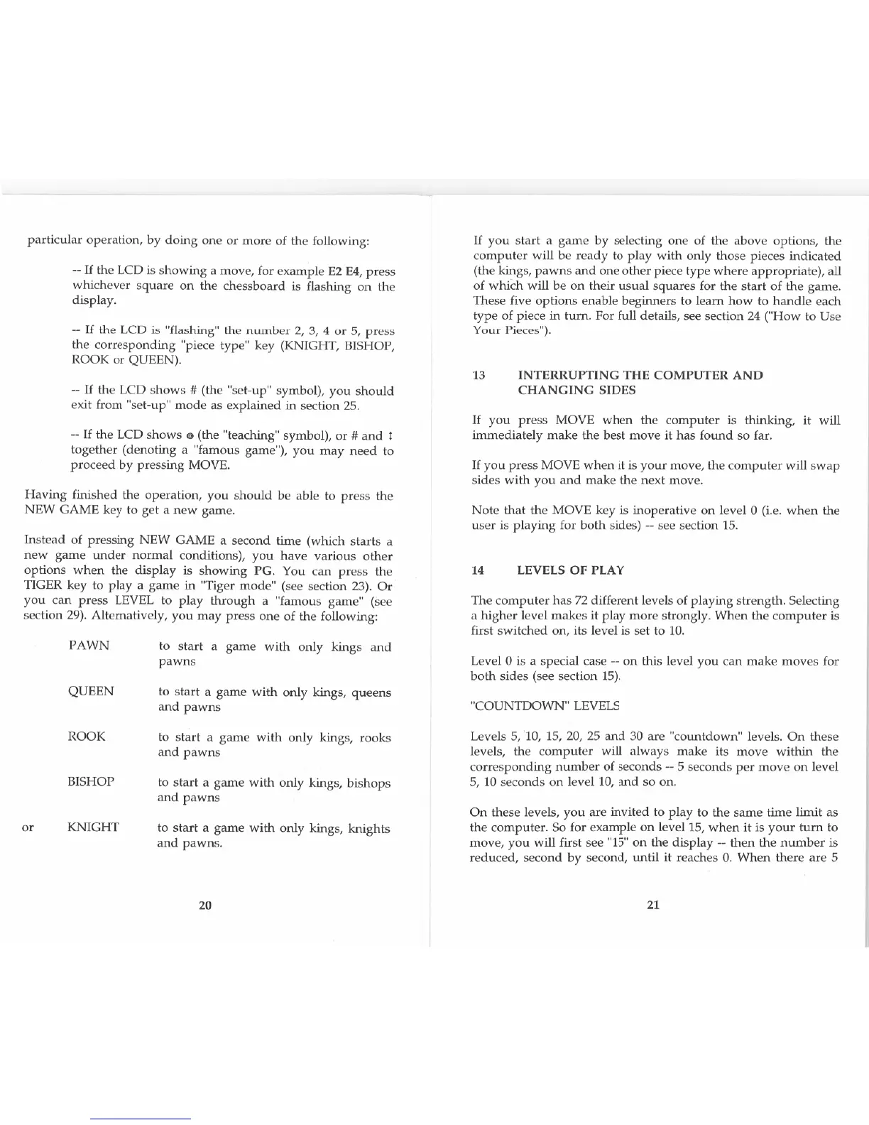 Tiger 11-007 - ADVANCED USAGE OPTIONS; INTERRUPTING COMPUTER AND CHANGING SIDES; LEVELS OF PLAY OVERVIEW