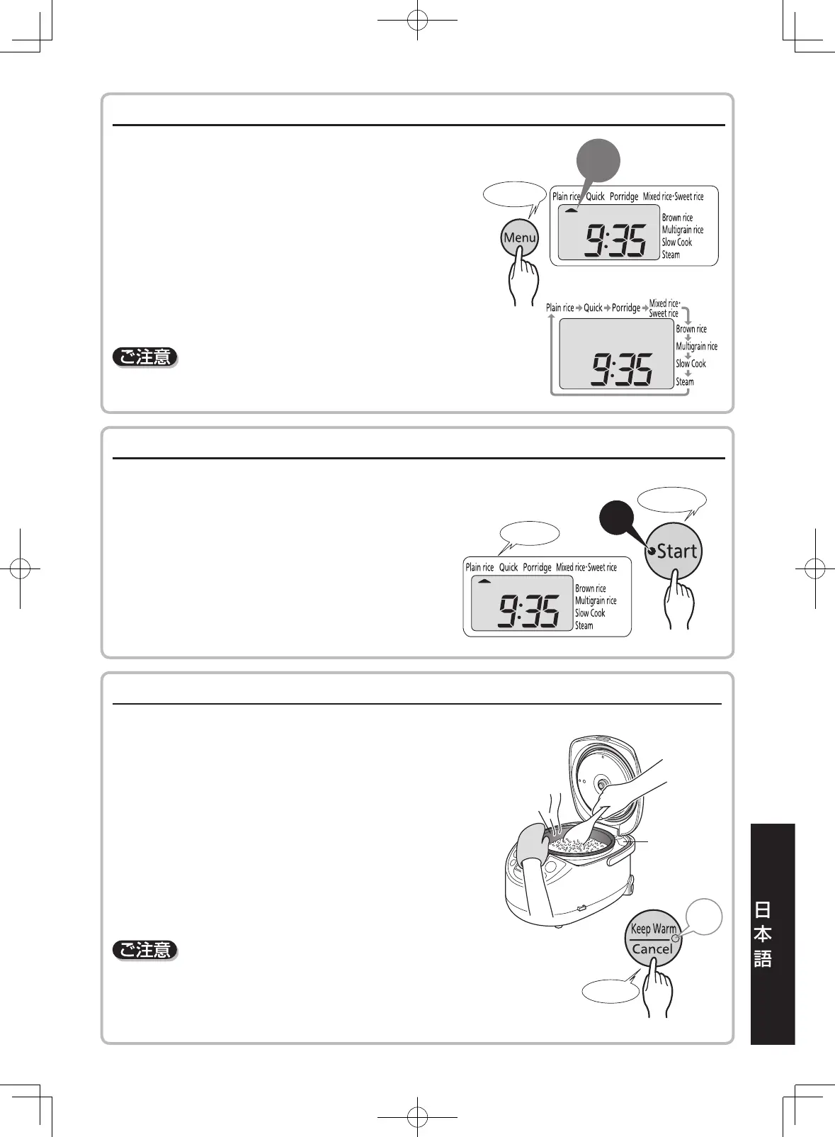 ●「Porridge」を選んだ場合を除き、炊きあがると自動的