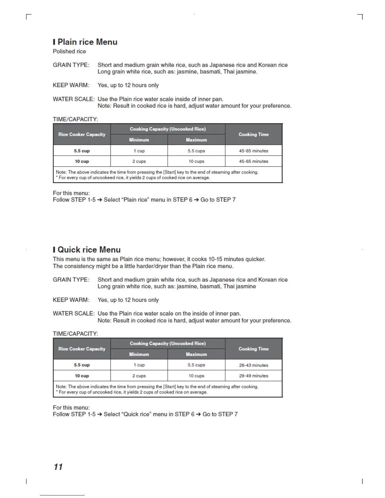 Tiger JBA-B10U - Plain Rice Menu; Quick Rice Menu