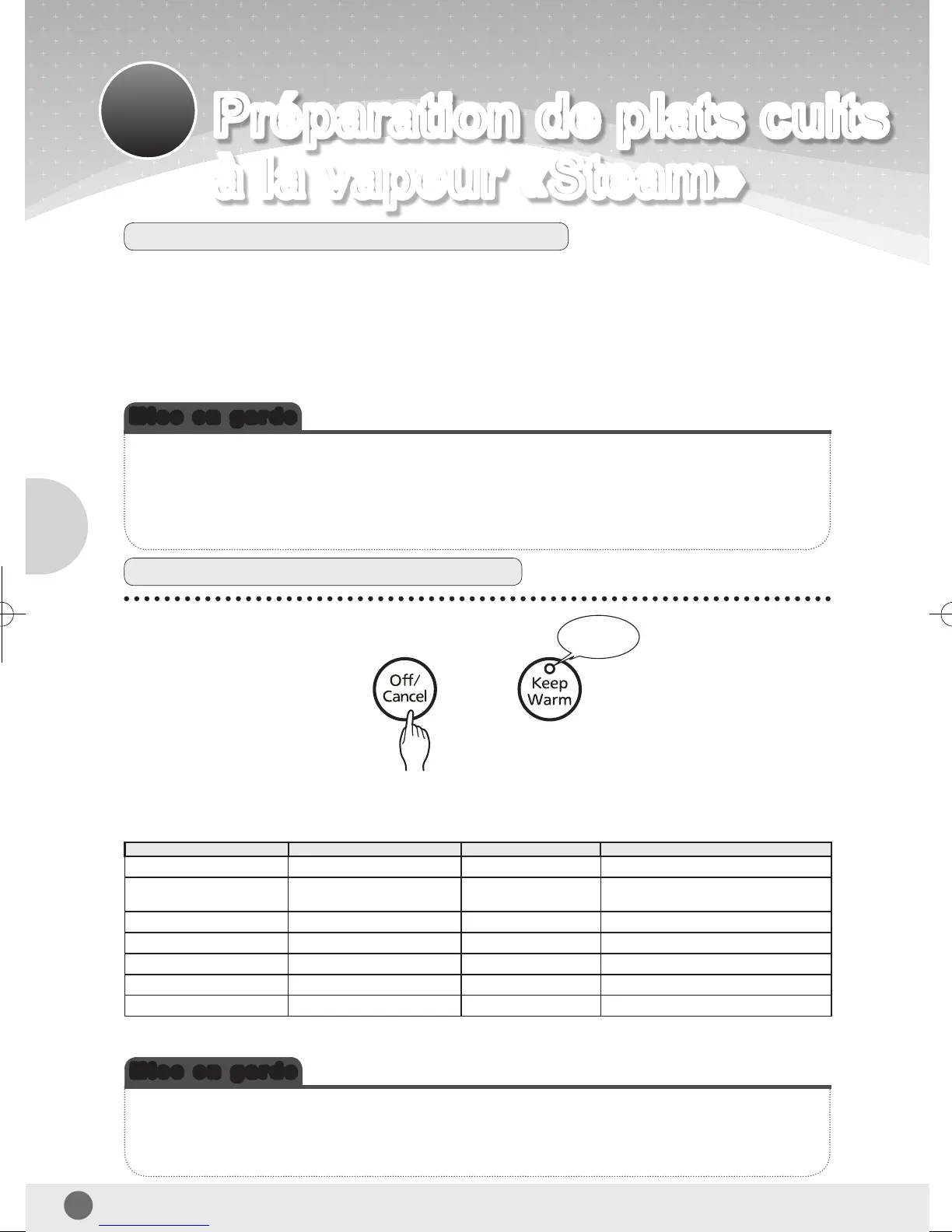 Nettoyez le cuiseur à riz le jour même de son utilisation pour la cuisson à la vapeur. (Consultez les pages 51 et 52)