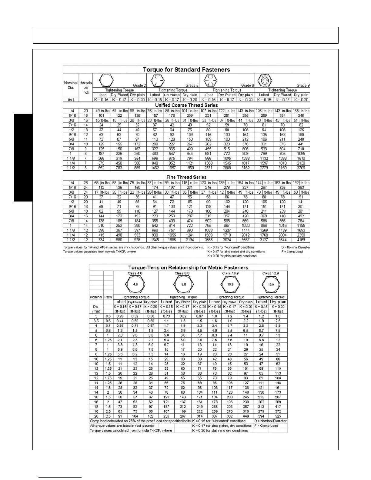 Tiger JOHN DEERE 5083E - Torque Specifications for Fasteners; Torque-Tension Relationship for Metric Fasteners