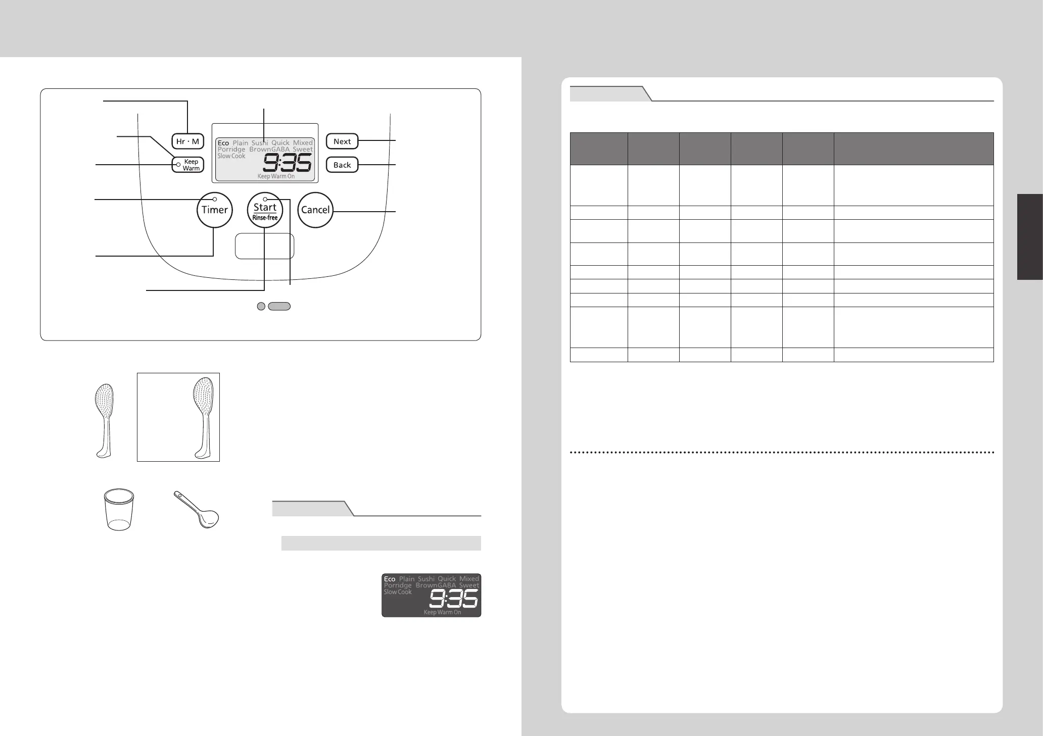 “Eco”、“Plain”、“Sushi”、“Quick”、“Mixed”、“Porridge”菜单可选择免洗米。无需在意水量和米的浸泡