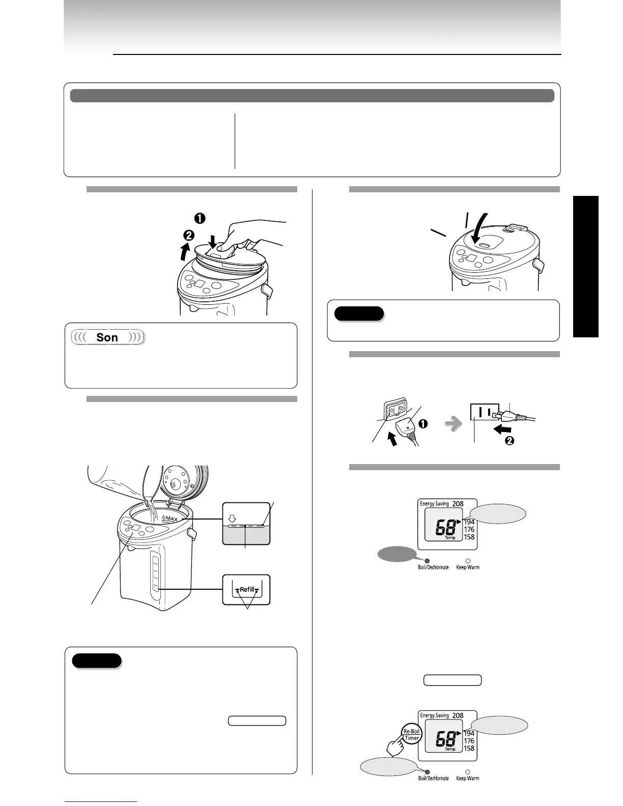 1. Ajouter de l'eau au niveau d'eau max puis porter à ébullition. (Voir