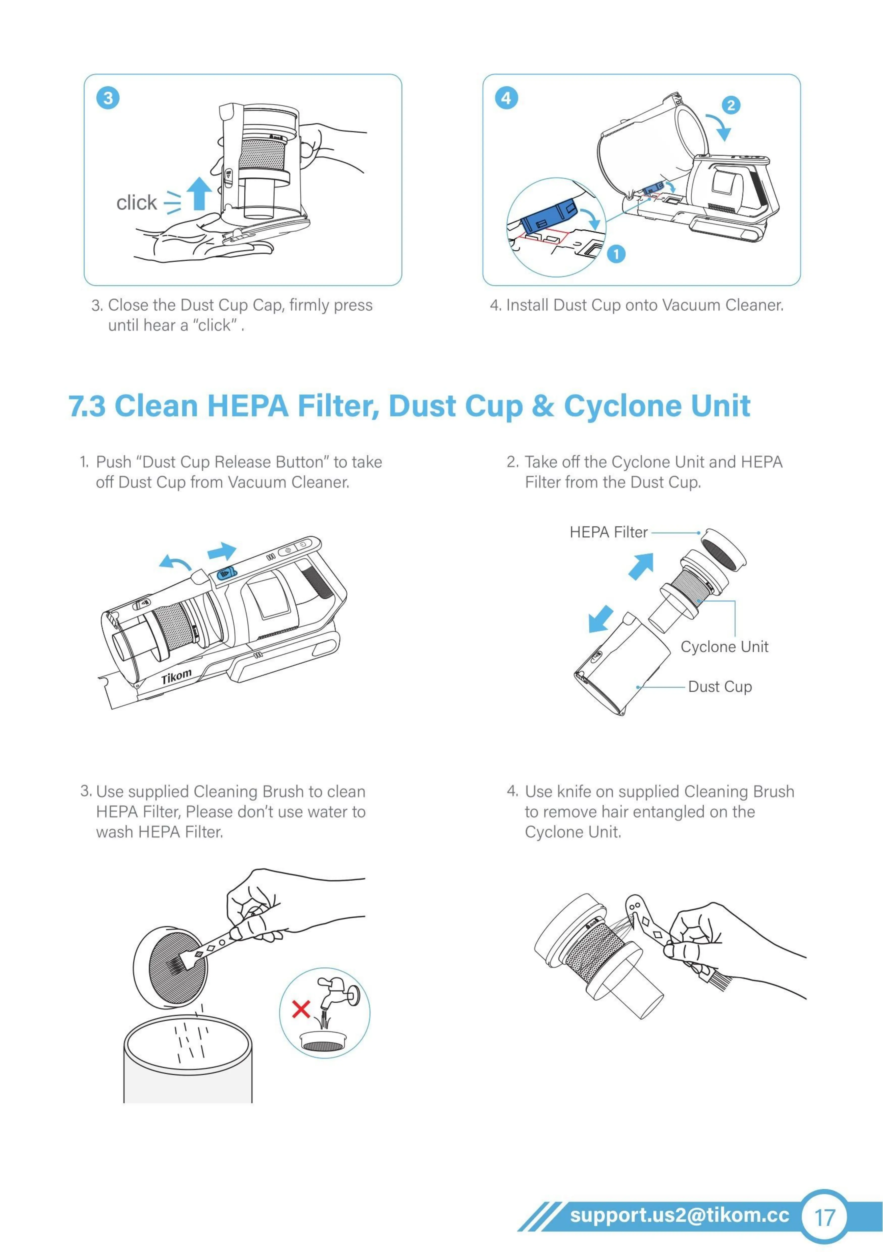 7.3 Clean HEPA Filter, Dust cup & Cyclone Unit